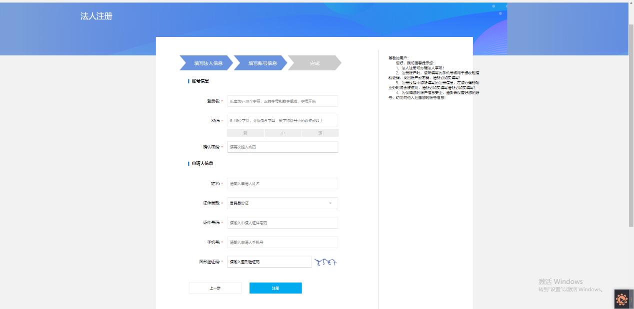 進(jìn)入系統(tǒng)前臺(tái)首頁(yè),切換至法人登錄,點(diǎn)擊注冊(cè),進(jìn)入法人填寫法人信息頁(yè)面,如下圖所示: