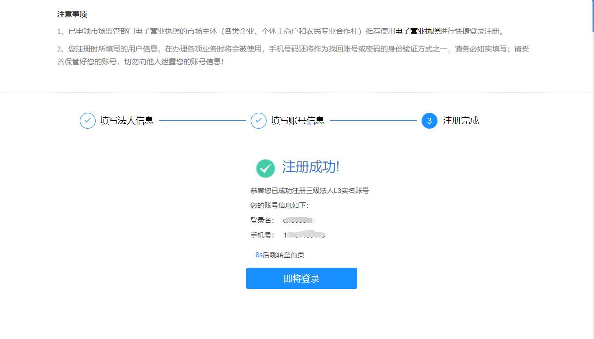 填寫賬號(hào)信息完成后,會(huì)提示注冊(cè)成功,10s后返回登錄頁(yè)面,點(diǎn)擊法人登錄,可用注冊(cè)賬號(hào)登錄,如下圖所示;