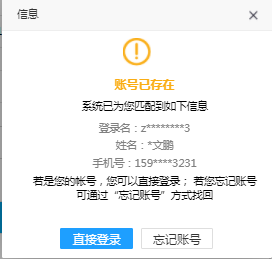 若當(dāng)前用戶信息已在系統(tǒng)中注冊(cè)過(guò)賬號(hào),會(huì)彈出提示顯示已存在賬號(hào)的相關(guān)信息,引導(dǎo)用戶去找回賬號(hào)或直接登錄。