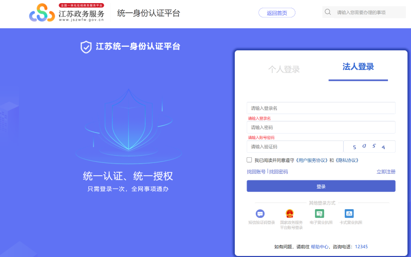 法人用戶在政務服務網登錄辦理個人的相關業務,可在瀏覽器中輸入政務服務網地址http://www.wwwkanjuba.com,打開網站后將鼠標放到右上角“登錄”按鈕上彈出“個人登錄”和“法人登錄”后,點擊“法人登錄”,跳轉到法人的登錄首頁進行登錄。法人登錄可以采用五種方式進行登錄,即賬號密碼登錄、手機號登錄、國家政務服務平臺賬號登錄、電子營業執照登錄、卡式營業執照登錄。