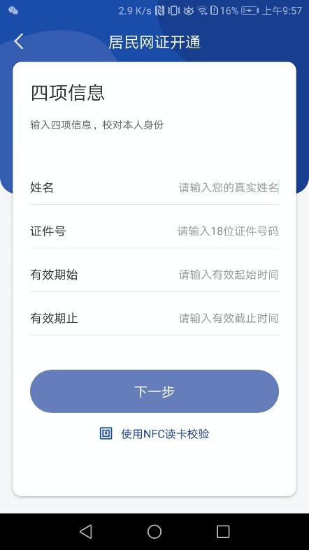 B.選擇“確定”進入“四項信息”頁面。點擊四項信息填寫頁面中的“使用NFC讀卡校驗”,進入“居民身份證識別”頁面。