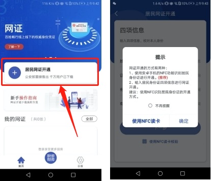 2.注冊并登錄完成后,點擊首頁“居民網證開通”,出現網證開通方式提示。