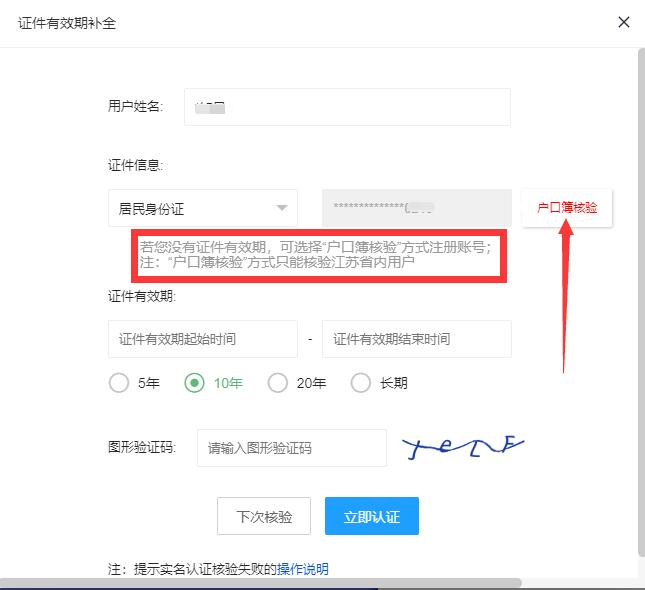 點(diǎn)擊“證件信息”右側(cè)“戶口簿核驗(yàn)”,根據(jù)頁(yè)面提示填寫(xiě)相應(yīng)戶口簿信息后點(diǎn)擊“立即認(rèn)證”,完成證件有效期補(bǔ)全。
