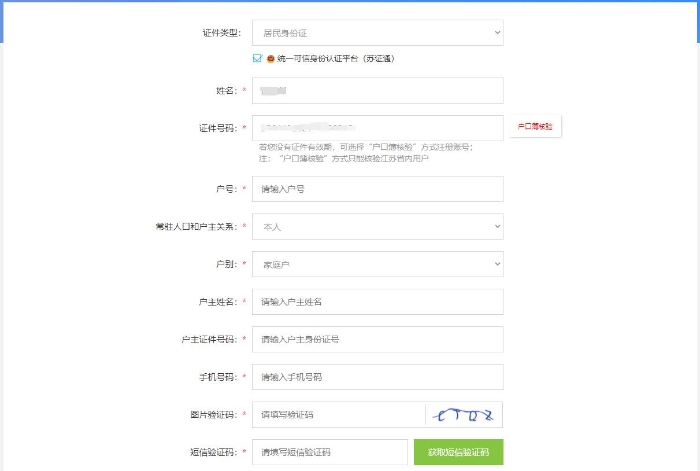 輸入身份證號(hào)碼后,點(diǎn)擊右側(cè)彈窗的“戶口簿核驗(yàn)”,根據(jù)頁(yè)面提示填寫(xiě)相應(yīng)的用戶信息、戶口簿信息、圖形驗(yàn)證碼和短信驗(yàn)證碼,設(shè)置密碼后完成注冊(cè)。